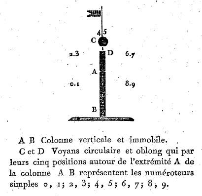 Les signes, dans les télégraphes actuels, correspondent à nos chiffres arabes ou vulgaires, dont le gouvernement et l'autorité avec laquelle il correspond ont seuls la clef; mais il m'est prouvé que l'on pourrait abréger le langage télégraphique, en conservant ces machines telles qu'elles sont, et en faisant signifier à chacun de ces signes une plus grande portion d'idée, sans introduire rien de vague dans la signification.