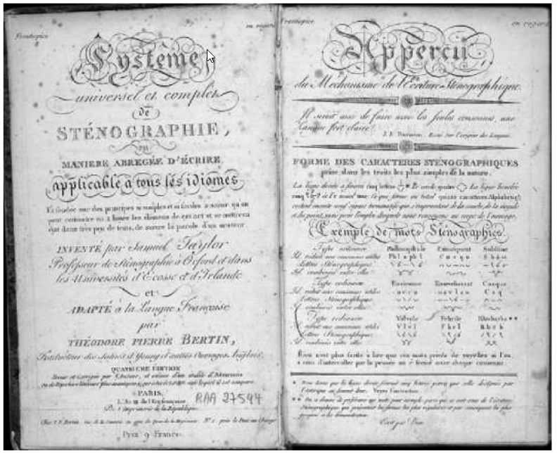Théodore-Pierre Bertin (2 novembre 1751, Provins - 25 janvier 1819, Paris) Théodore-Pierre Bertin a étudié la méthode Taylor à Londres. À son retour à Paris en 1791, il a traduit le livre « An essay intended to establish a standard for an universal system of Stenography, or Short-hand writing »