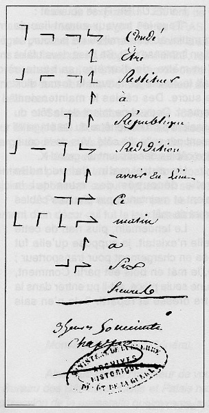 Il ne fut jamais question d’autre part - et c’est le seul exemple que nous connaissons - de remettre au destinataire le texte en clair et les signaux. Com- ment aurait-on pu dans de telles conditions assurer le secret des correspondances?