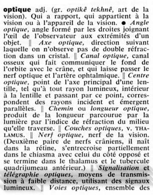 NDLR : Ci-contre, copie sur l’adjectif « Optique » relevé dans le Larousse en 3 volumes édition 1966. Signalisation et télégraphie optiques, moyens de transmission à faible distance, utilisant des signaux lumineux. Gardons-nous donc d’utiliser ce terme pour le TÉLÉGRAPHE CHAPPE. Il en est de même pour « SÉMAPHORE » télégraphe en bordure de mer, pour correspondre avec les navires.